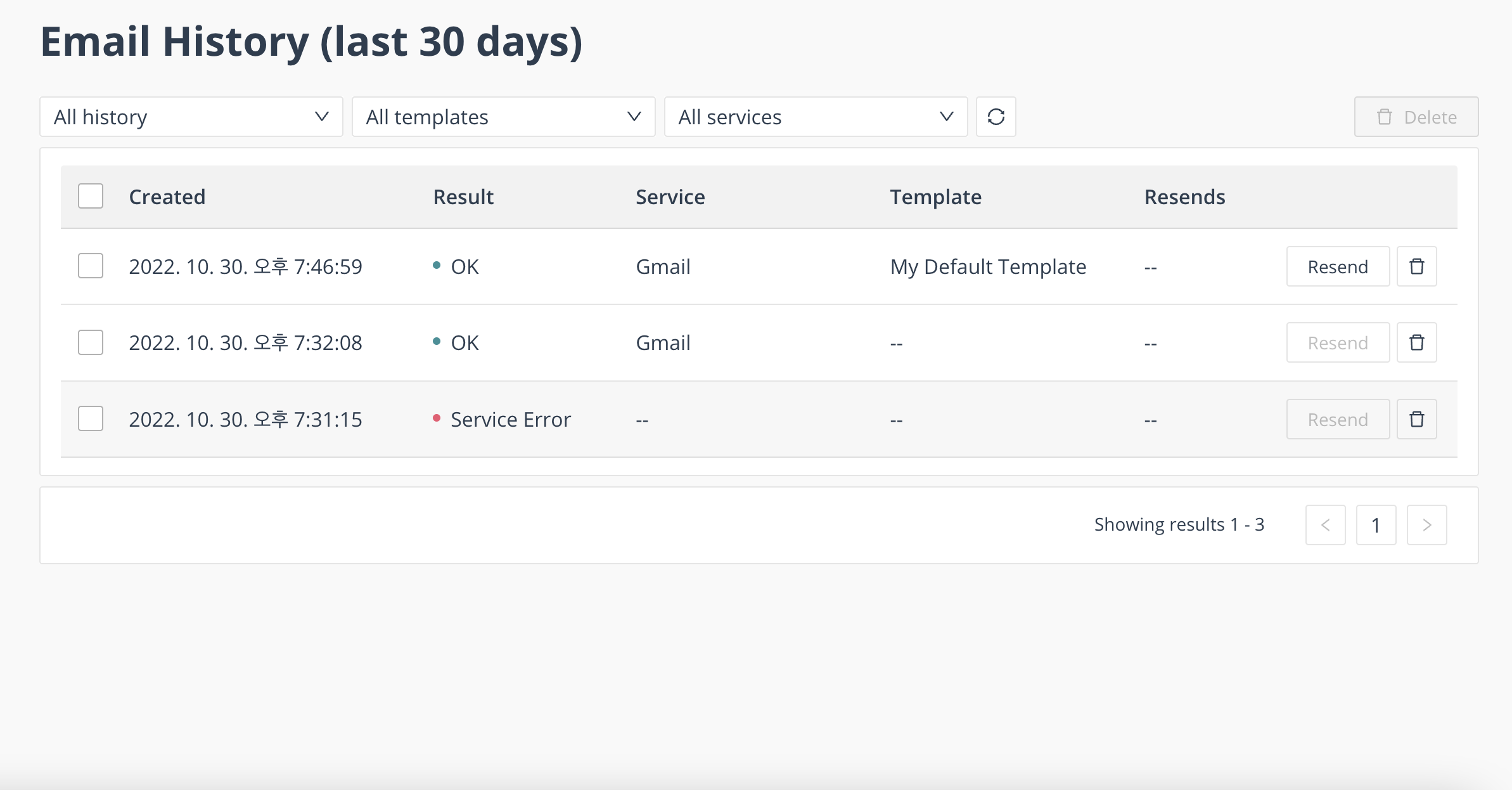 위의 이미지처럼 메일이 정상적으로 갔다면 Email History 메뉴에서 확인이 가능하다.
