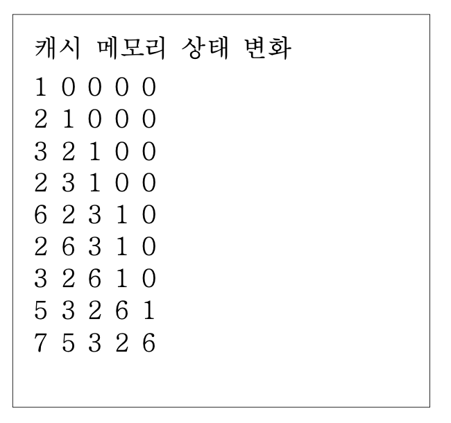 캐시메모리는 CPU와 주기억장치(DRAM) 사이의 고속의 임시 메모리로서 CPU가 처리할 작업 을 저장해 놓았다가 필요할 바로 사용해서 처리속도를 높이는 장치이다. 워낙 비싸고 용량이 작아 효율적으로 사용해야 한다. 철수의 컴퓨터는 캐시메모리 사용 규칙이 LRU 알고리즘을 따 른다. LRU 알고리즘은 Least Recently Used 의 약자로 직역하자면 가장 최근에 사용되지 않 은 것 정도의 의미를 가지고 있습니다. 캐시에서 작업을 제거할 때 가장 오랫동안 사용하지 않은 것을 제거하겠다는 알고리즘입니다.